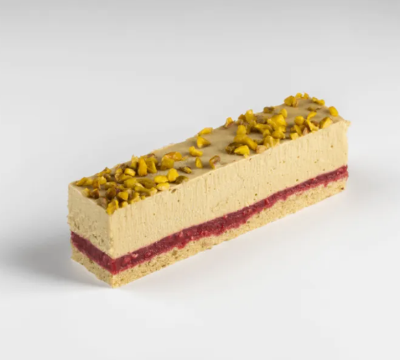 A puha pisztáciás piskótának és a krémes moussenak köszönhetően már az első harapásnál érezheted az intenzív pisztácia ízt. Mindemellé a torta közepén található savanykásan édes málna inzert frissességet és vibráló kontrasztot visz az összképbe. A sztorit végezetül a ropogós isztácia töret teszi teljessé, így válik minden harapás ízünneppé a szádban.